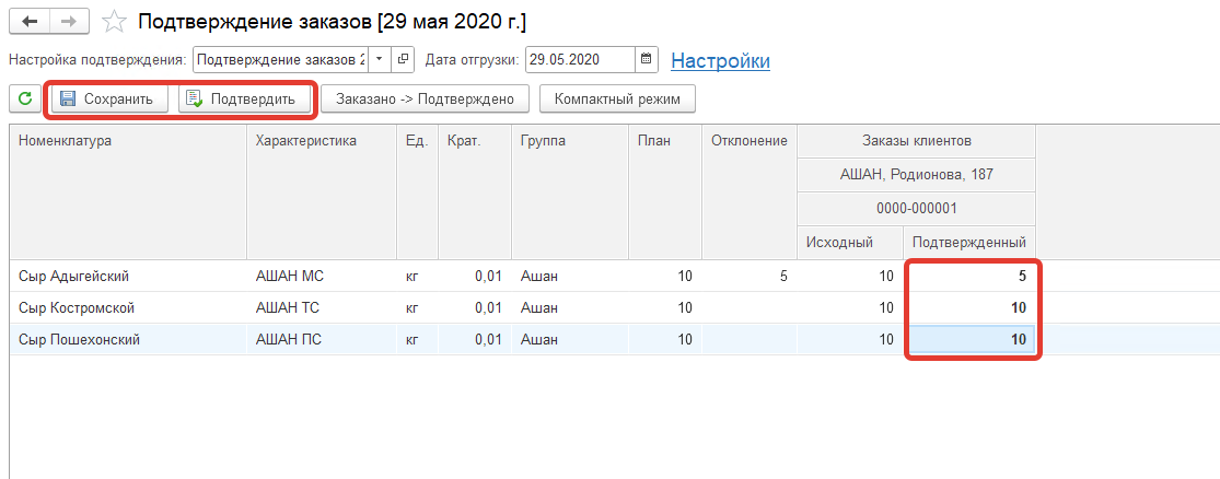 Вносим подтвержденное количество товаров и нажимаем кнопку "Сохранить" для сохранения заказов, а затем "Подтвердить" для установки статуса - Заказ клиента подтвержден.