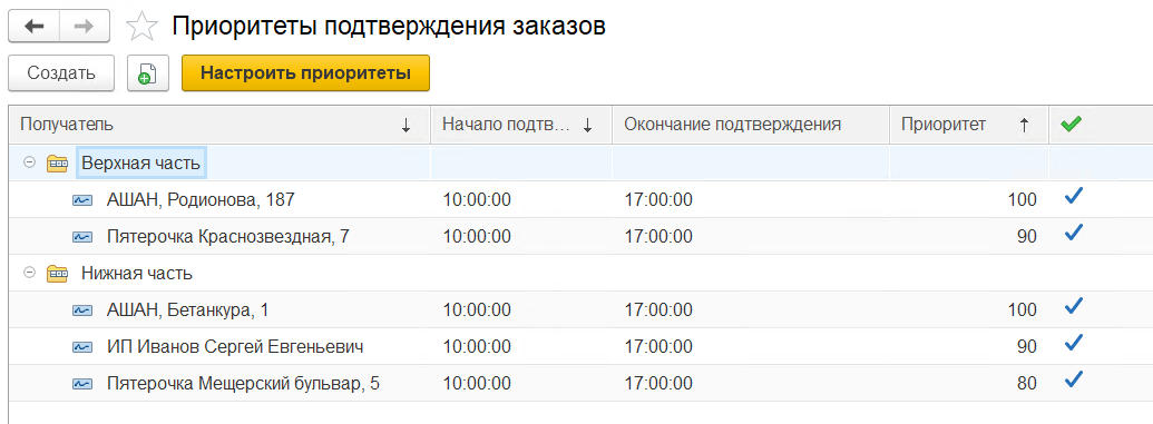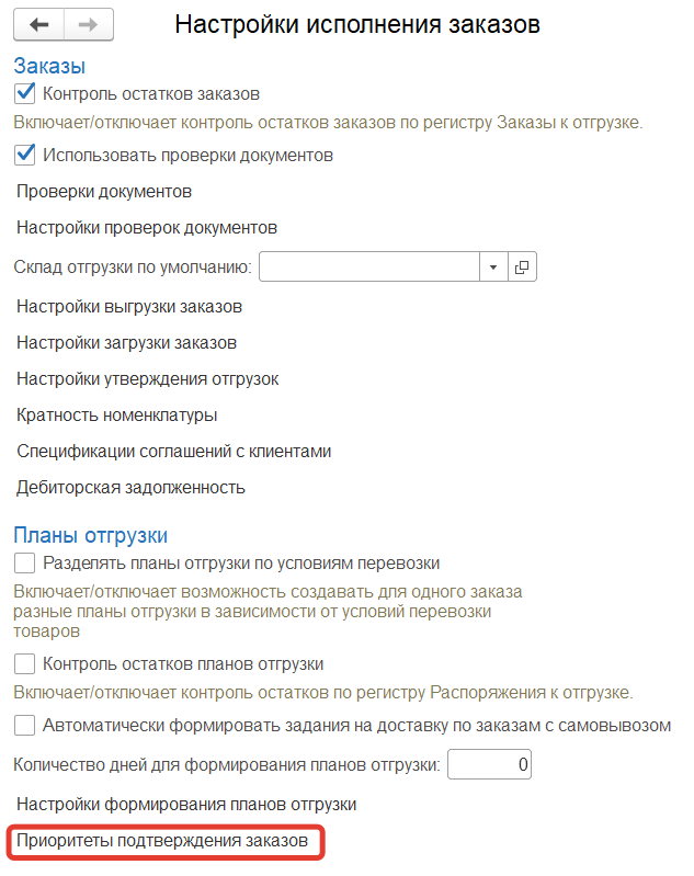 Подтверждение заказов клиентов осуществляется в соответствии с "Приоритетами подтверждения заказов", которые настраиваются в "Настройках исполнения заказов"