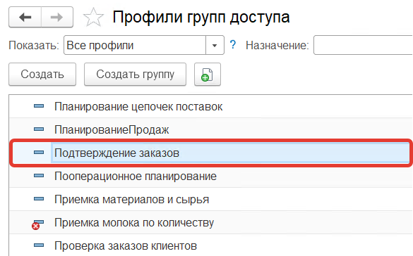 Для пользователей, которые занимаются подтверждением заказов в системе создан поставляемый профиль доступа "Подтверждение заказов".