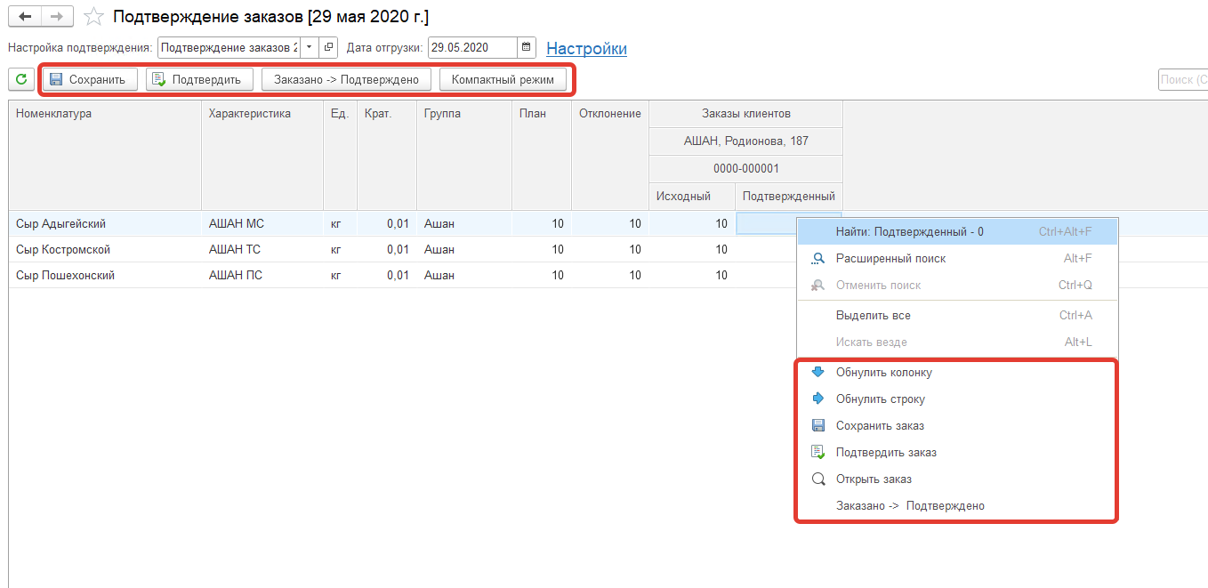 - Обнулить колонку - обнуляется колонка, отвечающая за подтвержденное количество в выбранном заказе