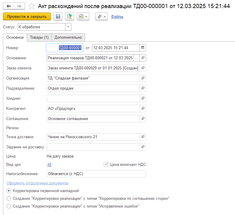 Акт расхождений создается на основании документа "Реализация товаров", поэтому вкадка "Основное" заполняется автоматически и не доступна для изменения кроме выбора способа корректировки