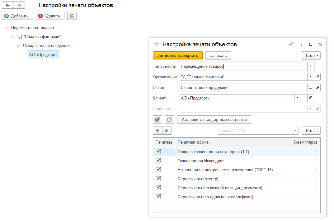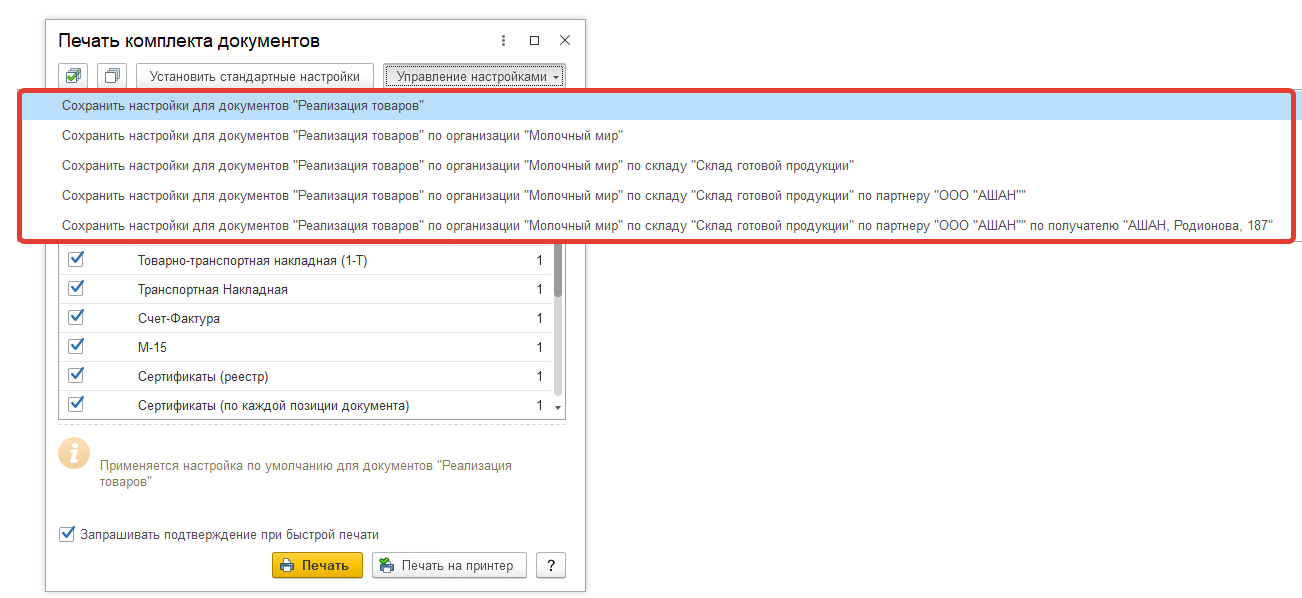 Настройки комплектов можно создавать / изменять прямо из документа-объекта по кнопке "Печать" - "Комплект документов с настройкой"