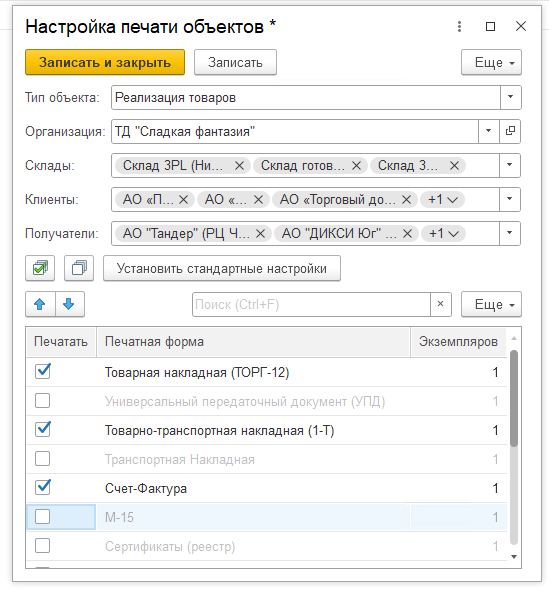 - Для документов "Реализации товаров" для выбранных организации, склада и контрагента - настройки будут действовать для всех документов данной организации с выбранным складом и контрагентом за исключением тех для которых были установлены настройки по получателю