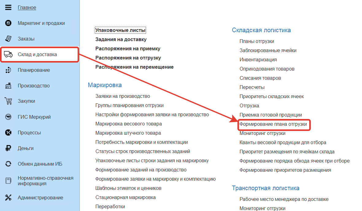 Для создания планов отгрузки используется обработка "Формирование плана отгрузки", которая расположена в разделе "Склад и доставка" в подсистеме "Складская логистика".
