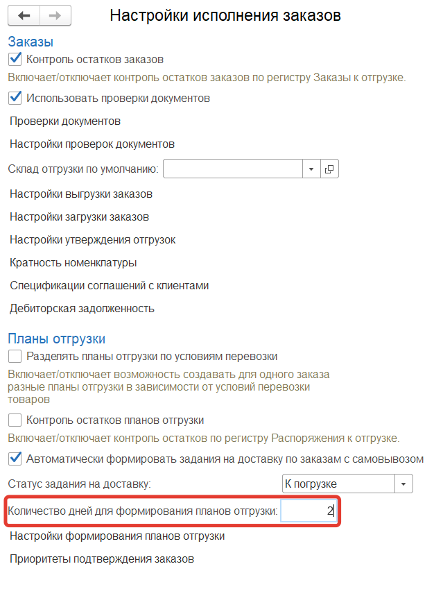 В Настройках исполнения заказов указывается количество дней для формирования планов отгрузки. Эта константа отвечает за то на сколько дней вперед от текущей даты формируются планы отгрузки. Укажем 2.