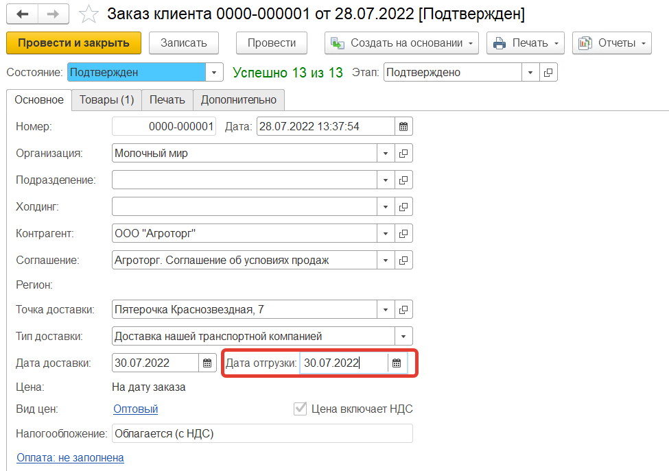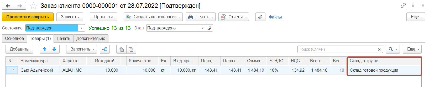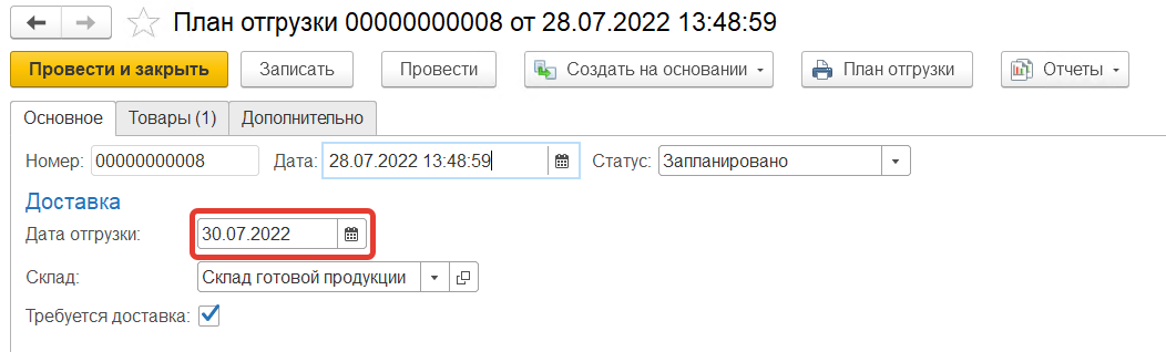 Создадим заказ клиента с датой отгрузки на следующий день от текущей даты и складом - Склад готовой продукции: