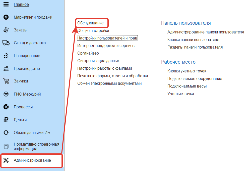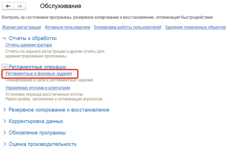 Переходим к формированию плана отгрузки регламентным заданием. В разделе Администрирование выбираем Обслуживание - разворачиваем группу "Регламентные операции" и переходим к Регламентным и фоновым заданиям.