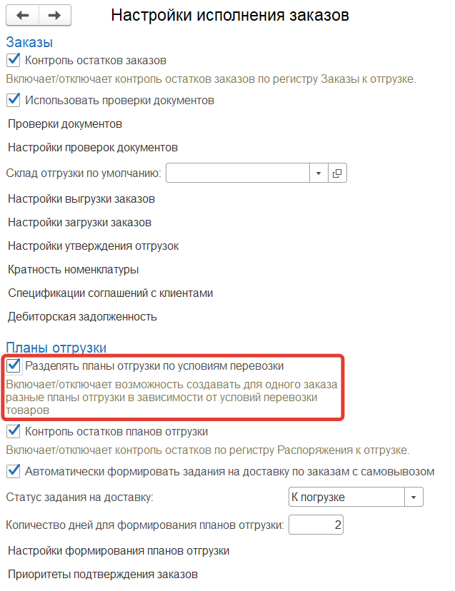Планы отгрузки можно формировать в зависимости от условий перевозки, для этого необходимо включить признак "Разделять планы отгрузки по условиям перевозки"