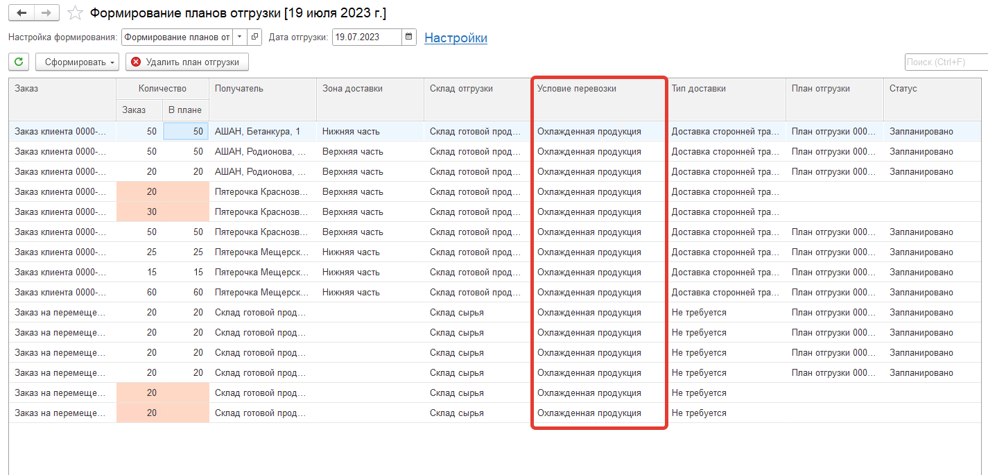 При формировании планов отгрузки они группируются по условиям перевозки: