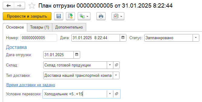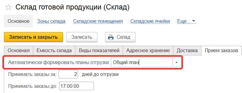 Для склада "Склад готовой продукции" укажем автоматическое формирование планов отгрузки - общий план.