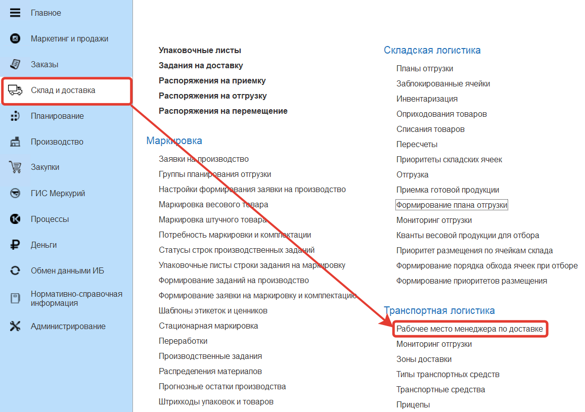 Для распределения планов отгрузки по машинам используется обработка "Рабочее место менеджера по доставке", которая расположена в разделе "Склад и доставка" в подсистеме "Транспортная логистика".