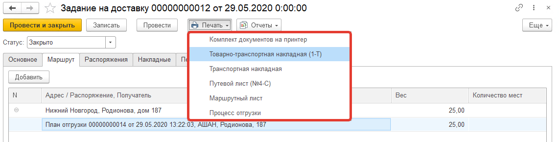 Для документа "Задание на доставку" используются печатные формы: "Товарно-транспортная накладная", "Транспортная накладная", "Путевой лист (№4-С)", "Маршрутный лист", "Процесс отгрузки". Так же можно распечатать документы комплектом.