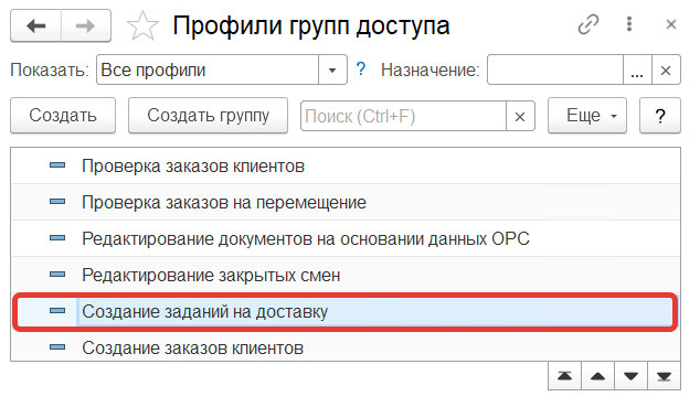 Для пользователей, которые занимаются созданием заданий на доставку в системе создан поставляемый профиль доступа "Создание заданий на доставку".