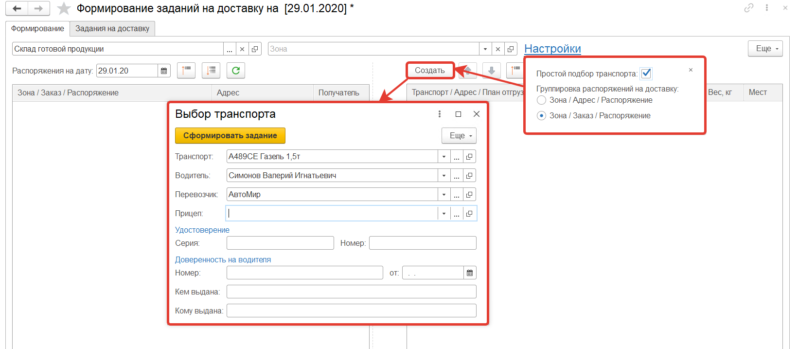 Заданию на доставку устанавливается статус из настроек. Если у планов отгрузки одинаковый склад и одинаковая точка доставки, то эти планы группируются в одно задание