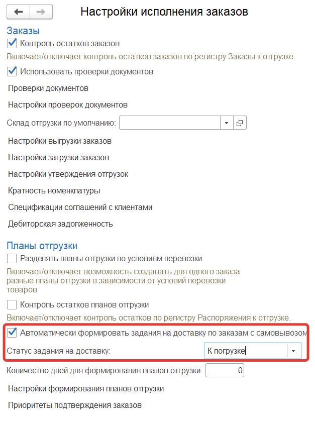 Если в Настройках исполнения заказов установлен признак Автоматически формировать задания на доставку по заказам с самовывозом, то при формировании планов отгрузки с типом доставки Самовывоз вместе с планами на отгрузку формируются "Задания на доставку"