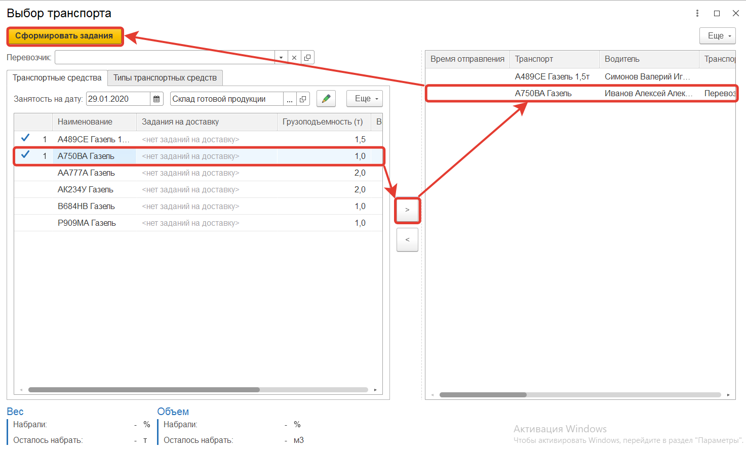 Для транспортных средств, по которым ранее начат процесс формирования заданий на перевозку, отображается период их планируемой занятости. В нижней части формы отображается информация о суммарном весе и объеме отгружаемого товара. А также обеспеченность подобранным транспортом в %.