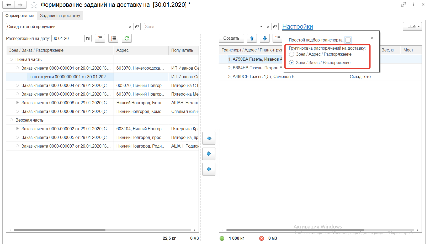 В левой таблице АРМа выводятся планы отгрузки и основная информация по ним: дата и время доставки, адрес, получатель, склад, вес, кол-во мест.