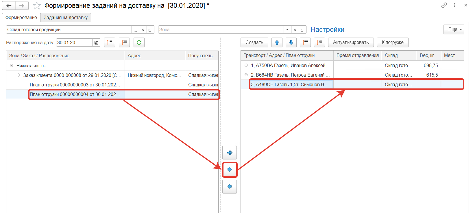 По кнопке Перенести в задание выбранные планы отгрузки перенесутся в текущее задание на доставку.