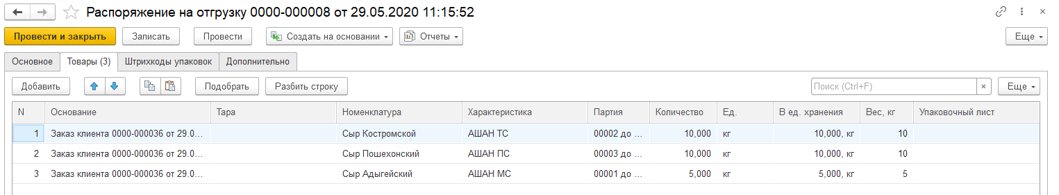 Переходим к "Распоряжению на отгрузку" и проверяем, что оно сформировалось корректно.