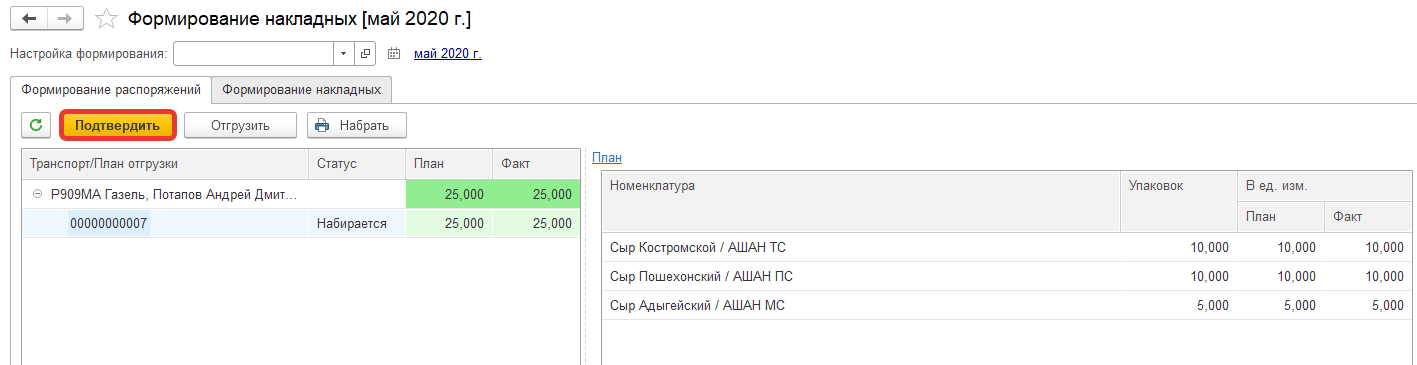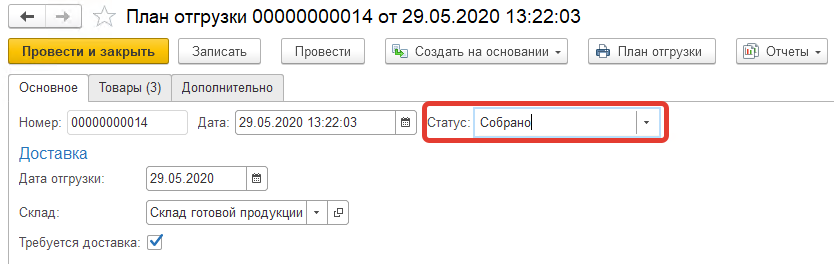 Для отражения завершения работы по отгрузке необходимо в обработке нажать на кнопку "Подтвердить", после этого "План отгрузки" будет переведен в статус Собрано и не будет отображаться в АРМе.