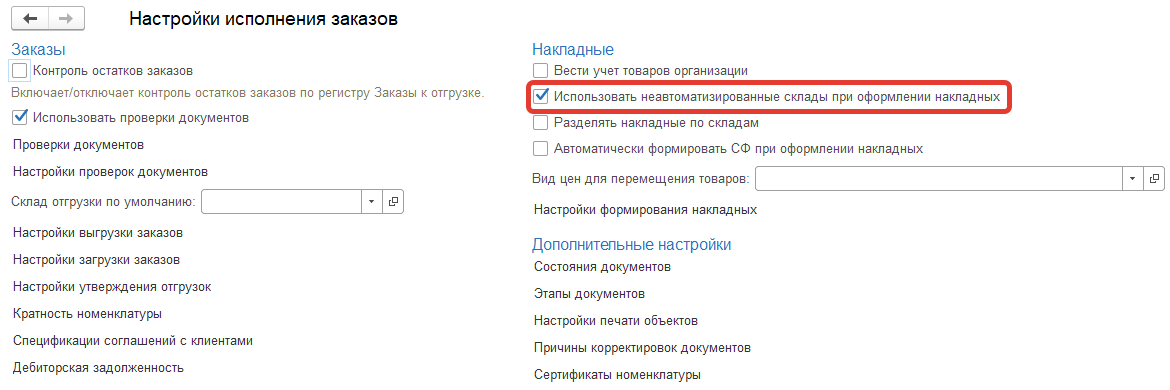 Для возможности работы с неавтоматизированными складами нужно в "Настройках исполнения заказов" установить флаг "Использовать неавтоматизированные склады при оформлении накладных".
