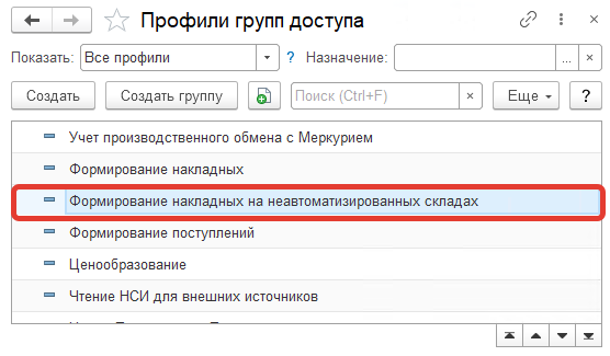 Для пользователей, которые занимаются созданием распоряжений на отгрузку и накладных для неавтоматизированных складов в системе создан поставляемый профиль доступа "Формирование накладных на неавтоматизированных складах".