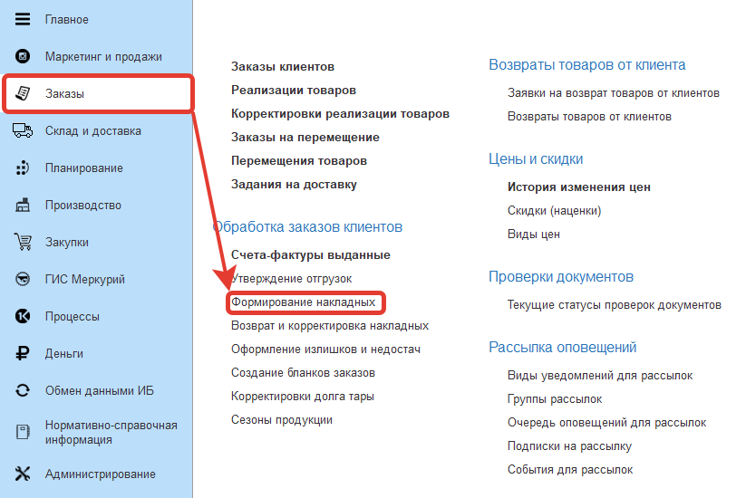 Для формирования "Распоряжений на отгрузку" на неавтоматизированном складе используется вкладка "Формирование распоряжений" обработки "Формирование накладных", которая расположена в разделе "Заказы" в подсистеме "Обработка заказов клиентов".