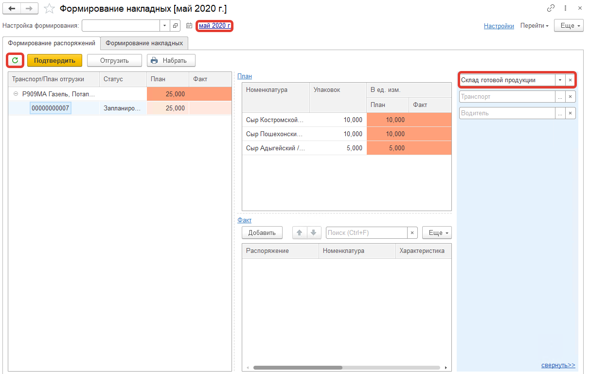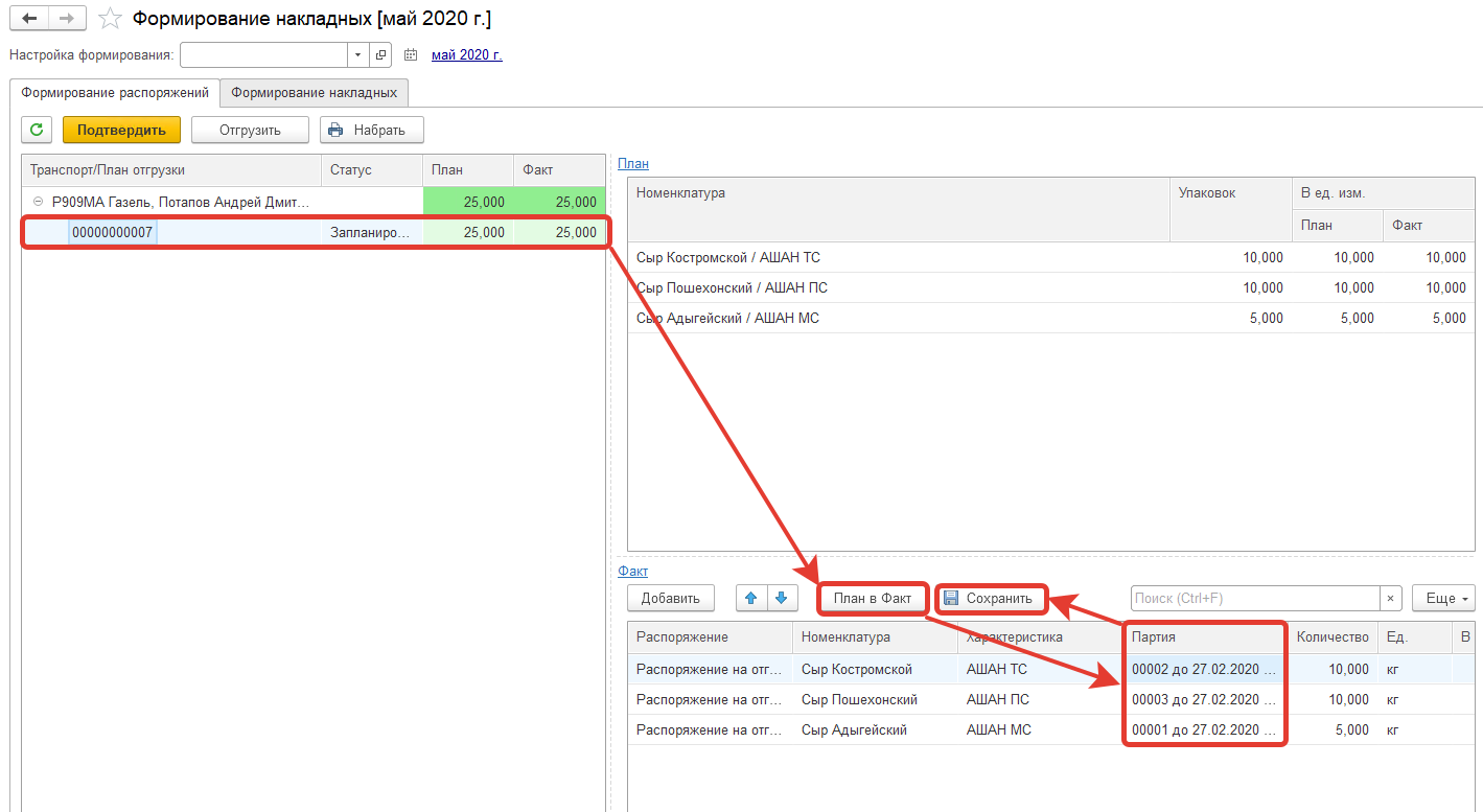 Далее переходим к плану отгрузки, с помощью кнопки "План в Факт" заполняем табличную часть отгружаемых товаров, заполняем серии для товаров: