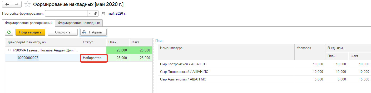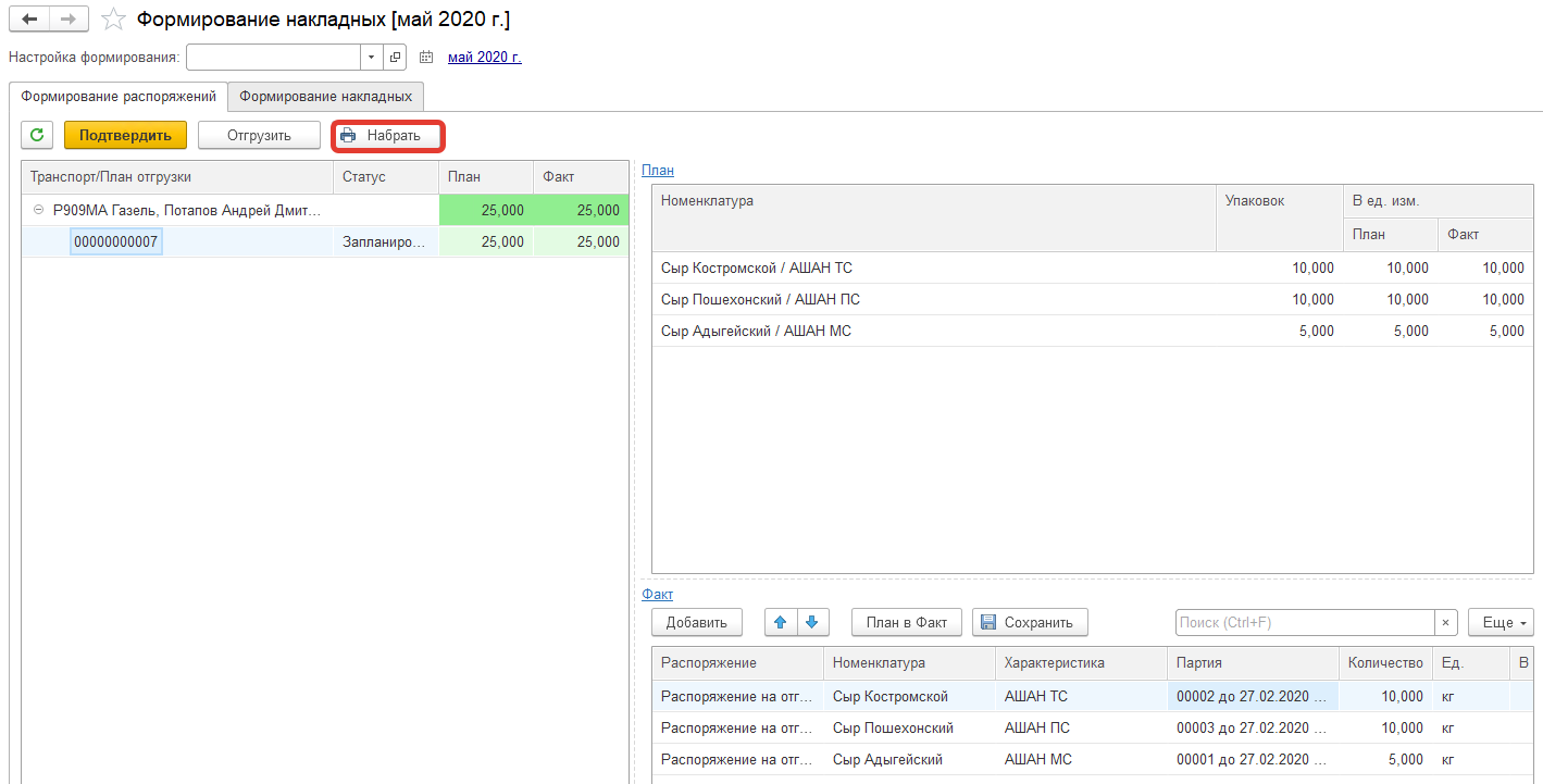 Для того, чтобы перевести план отгрузки в статус "Набирается" и распечатать для кладовщика список товаров для отгрузки, нажимаем кнопку "Набрать"