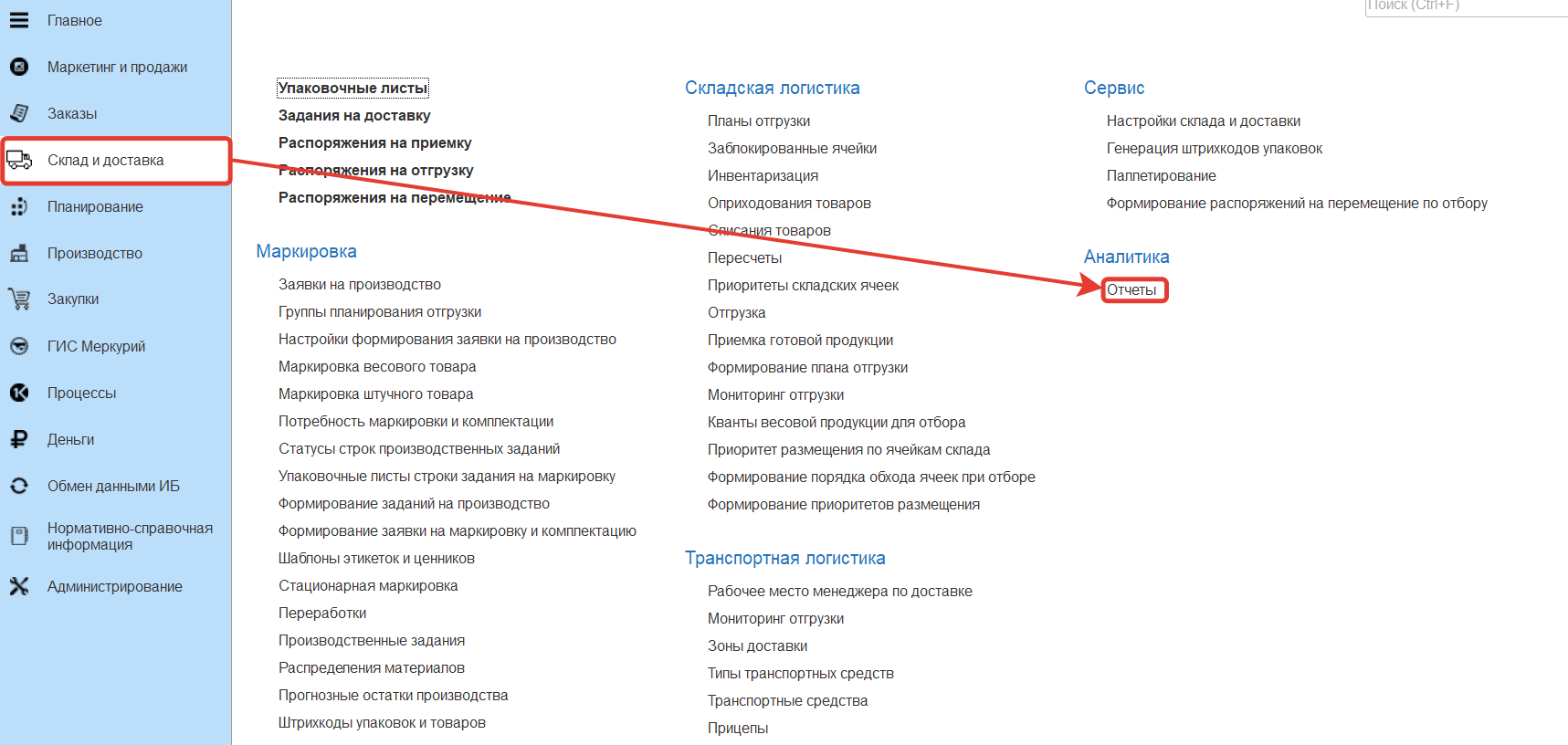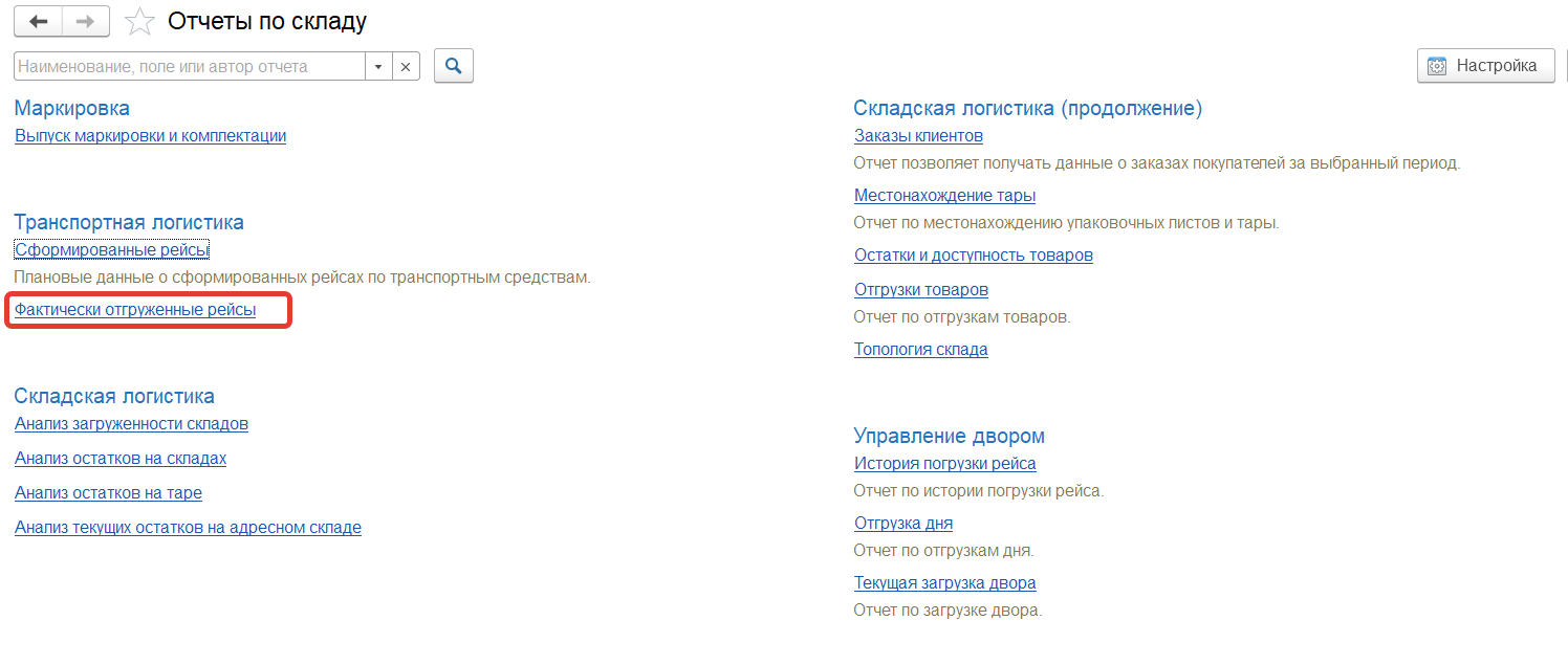 Для мониторинга данных об отправленных рейсах используется отчет "Фактически отгруженные рейсы" в разделе "Склад и доставка" в подсистеме "Аналитика" - "Отчеты"