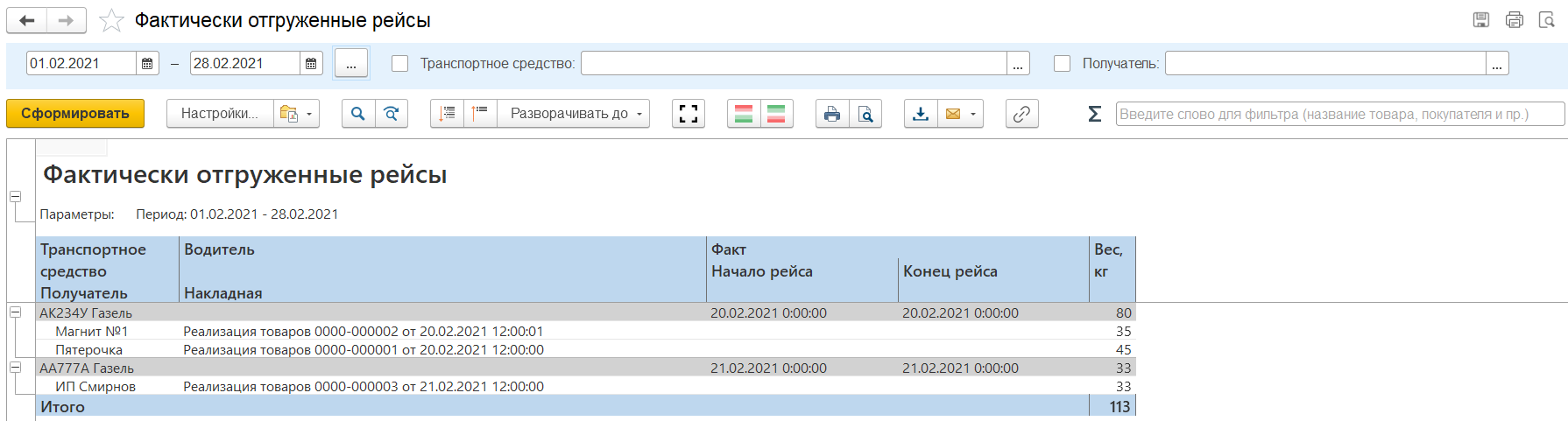 В отчете есть возможность установить отборы по транспортному средству и получателю