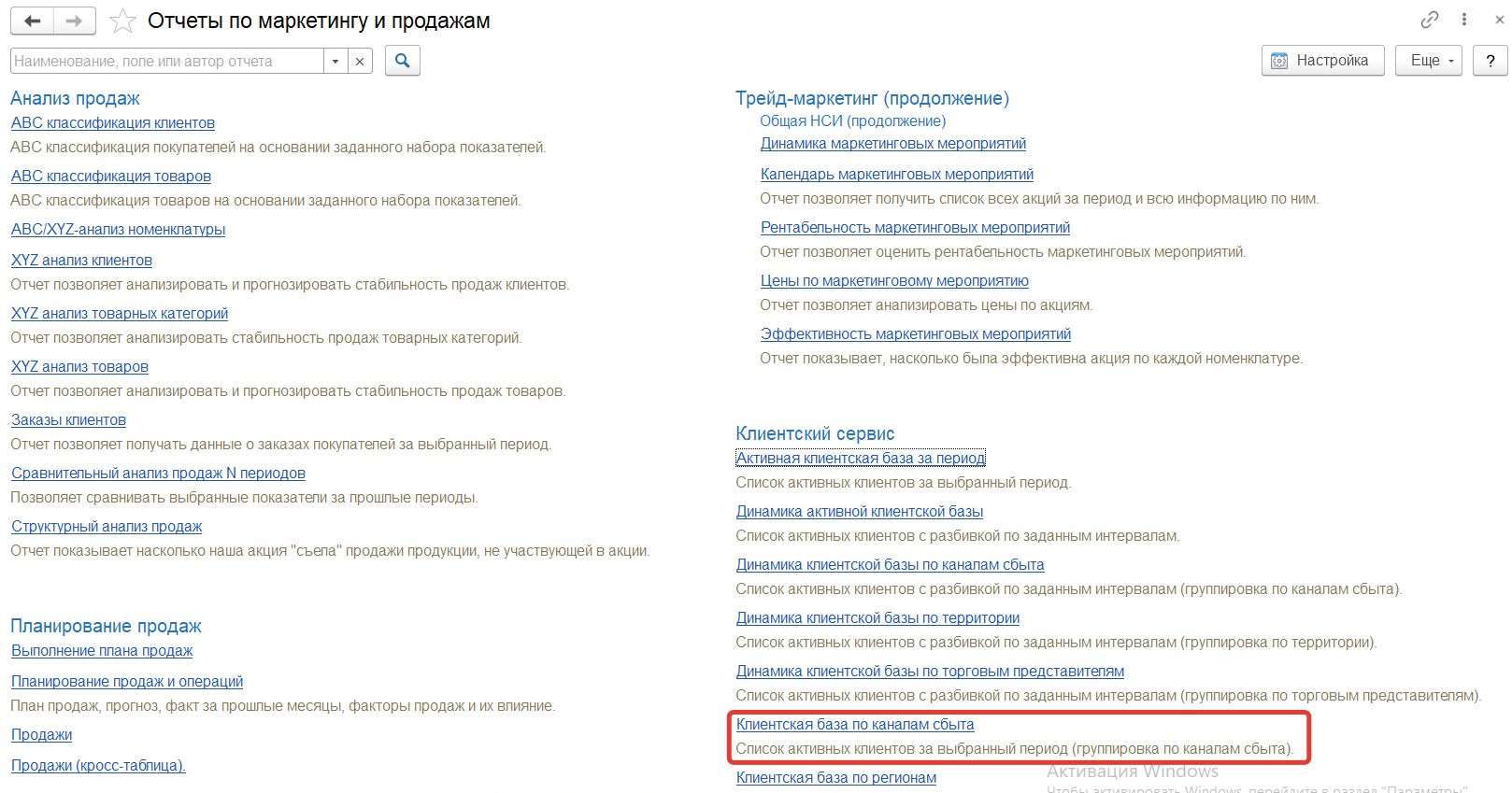 "Клиентская база по каналам сбыта" расположен в разделе Маркетинг и продажи" в подсистеме "Аналитика" - "Отчеты".
