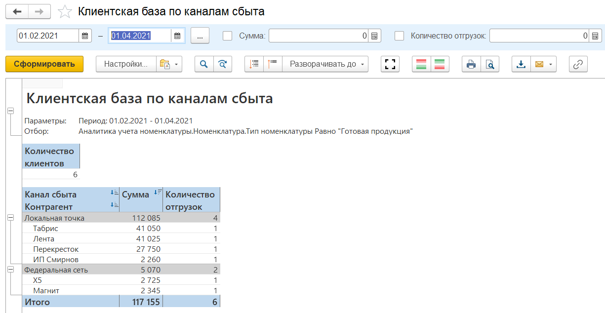 Отчет "Клиентская база по каналам сбыта" - показывает количество и список активных клиентов, сгруппированных по каналам сбыта.