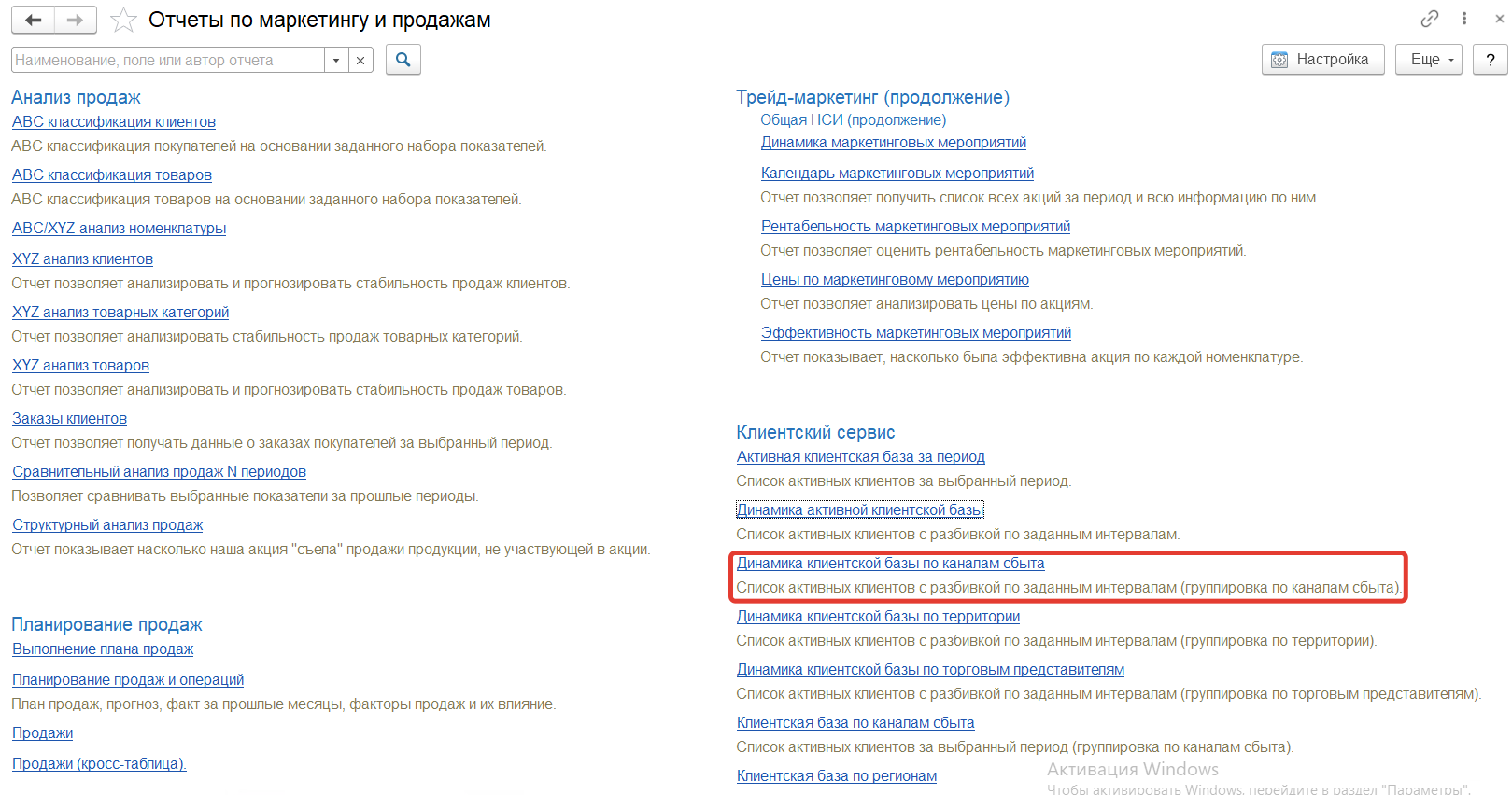 "Динамика клиентской базы по каналам сбыта" расположен в разделе Маркетинг и продажи" в подсистеме "Аналитика" - "Отчеты".