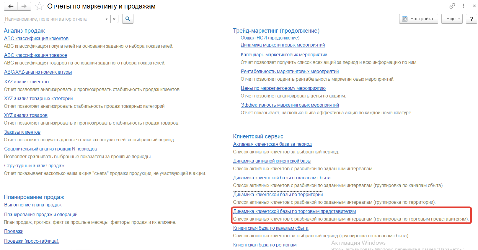 "Динамика клиентской базы по торговым представителям" расположен в разделе Маркетинг и продажи" в подсистеме "Аналитика" - "Отчеты".