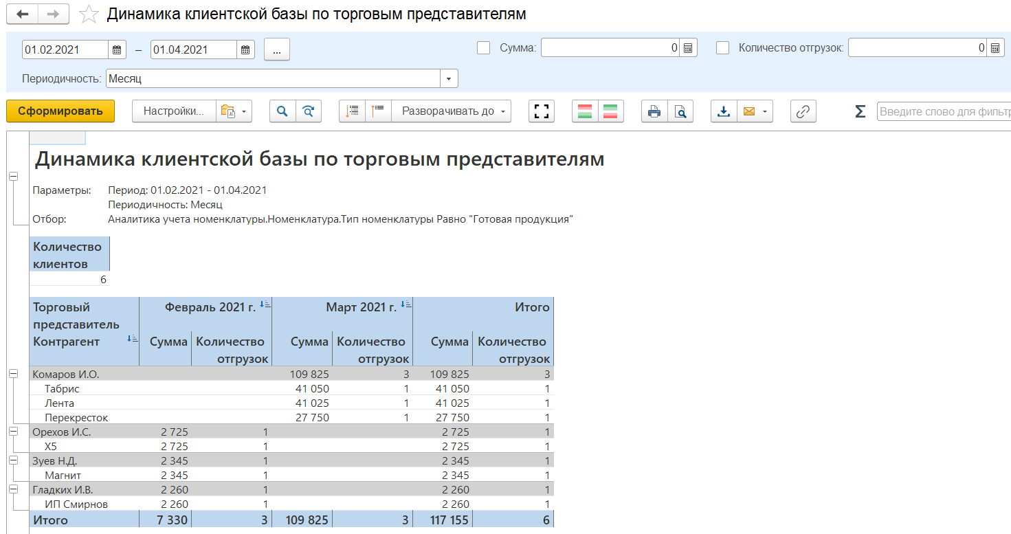 Отчет "Динамика клиентской базы по торговым представителям" - показывает количество и список активных клиентов, сгруппированных по торговым представителям. Активность клиентов определяется по периоду и интервалу (день, неделя, месяц, квартал, полугодие, год). Отчет позволяет анализировать в какую сторону стремится число активных клиентов.