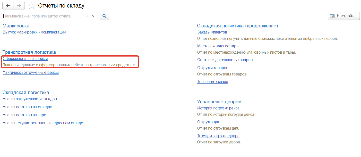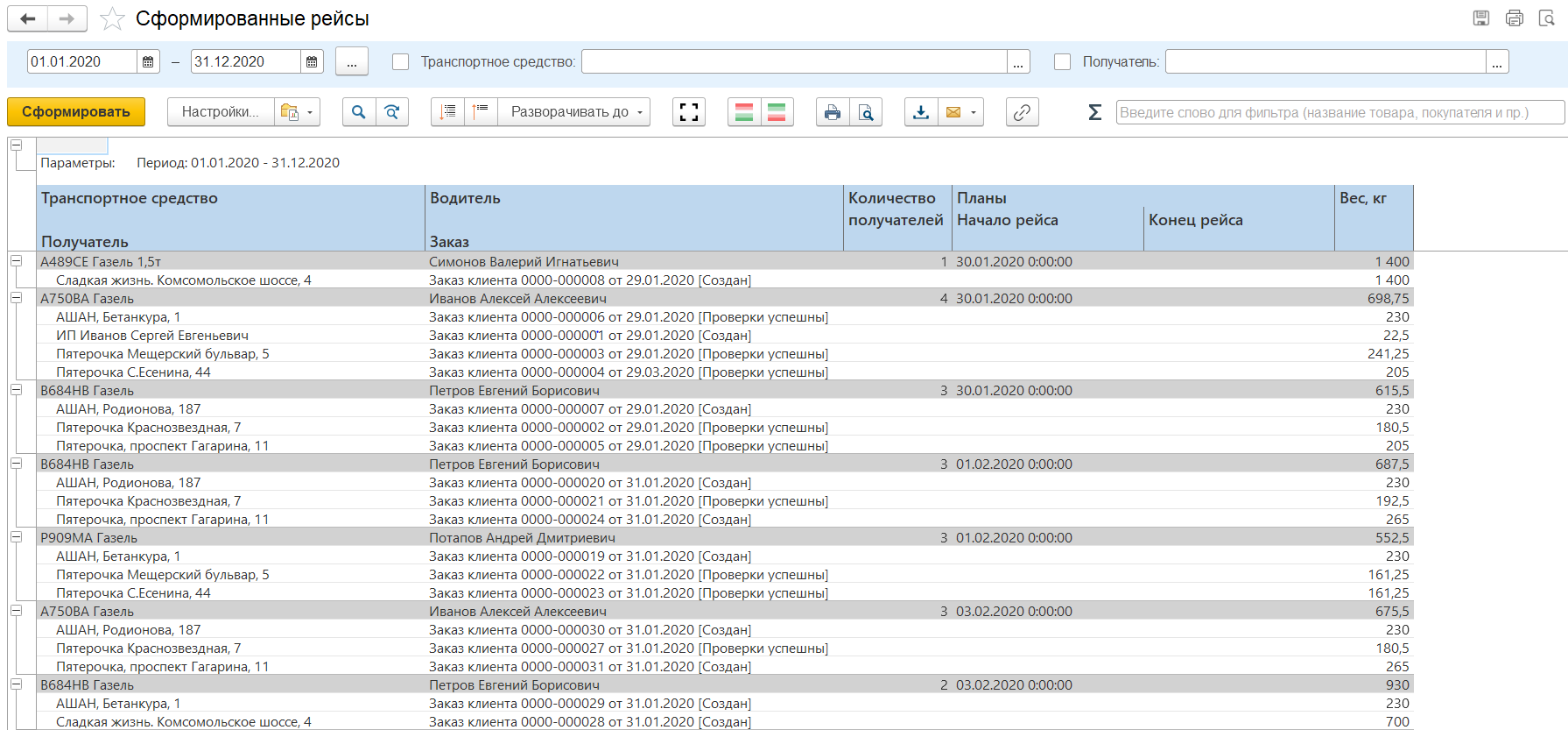 Для мониторинга данных о сформированных рейсах по транспортным средствам используется отчет "Сформированные рейсы" в разделе "Склад и доставка" в подсистеме "Аналитика" - "Отчеты"