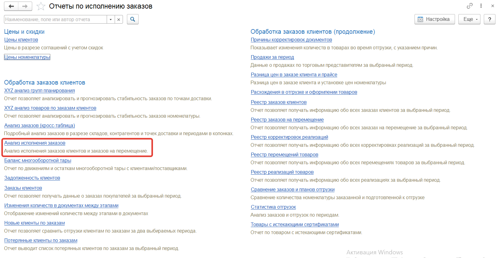 Он расположен в разделе "Заказы" в подсистеме "Аналитика" - "Отчеты".