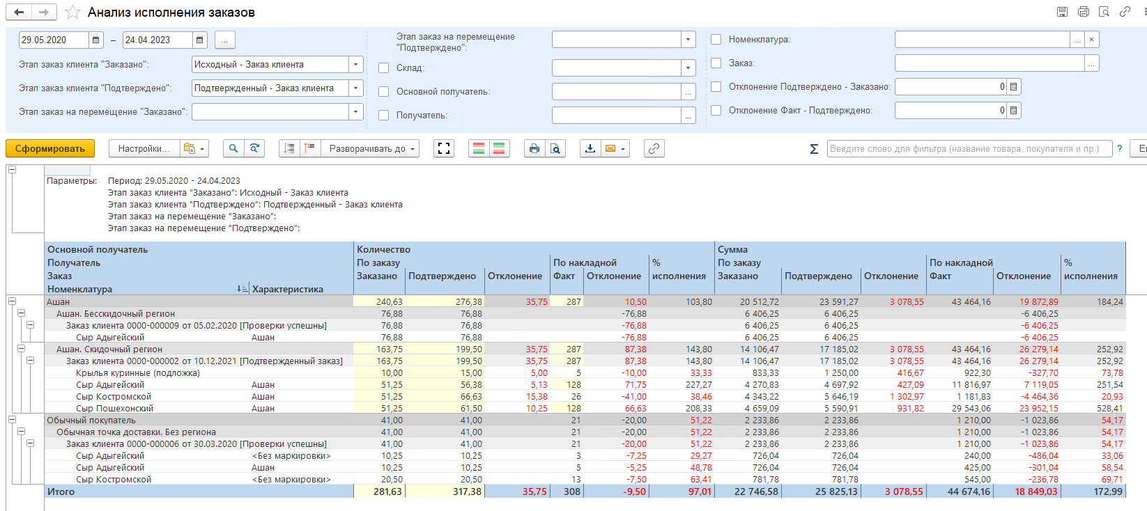 Отчет "Анализ исполнения заказов" - характеризует разницу между заказами и их накладными. Так же в отчете выводится информация о количестве товаров в заказах по этапам и отклонение между ними.