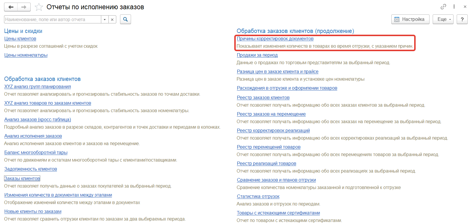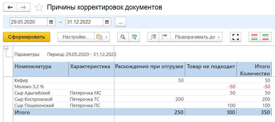 Отчет "Причины корректировок документов" - отражает как менялось количество товаров в разрезе причин корректировок