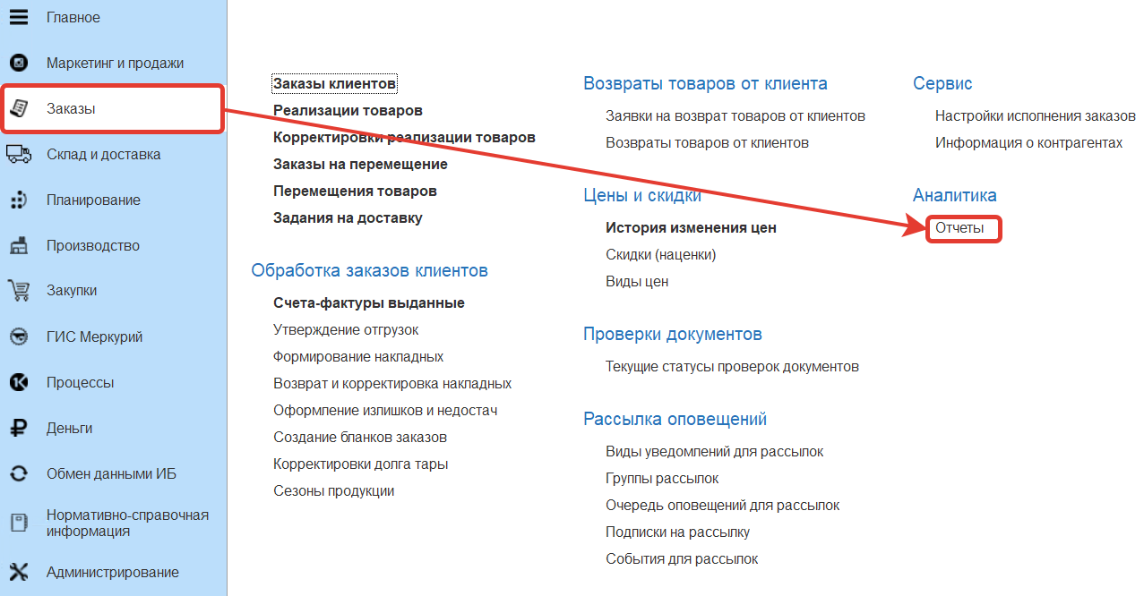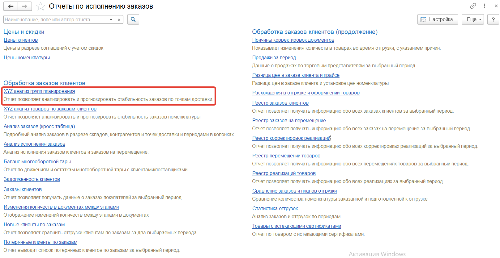 Отчет "XYZ анализ групп планирования" расположен в разделе "Заказы" в подсистеме "Аналитика" - "Отчеты".