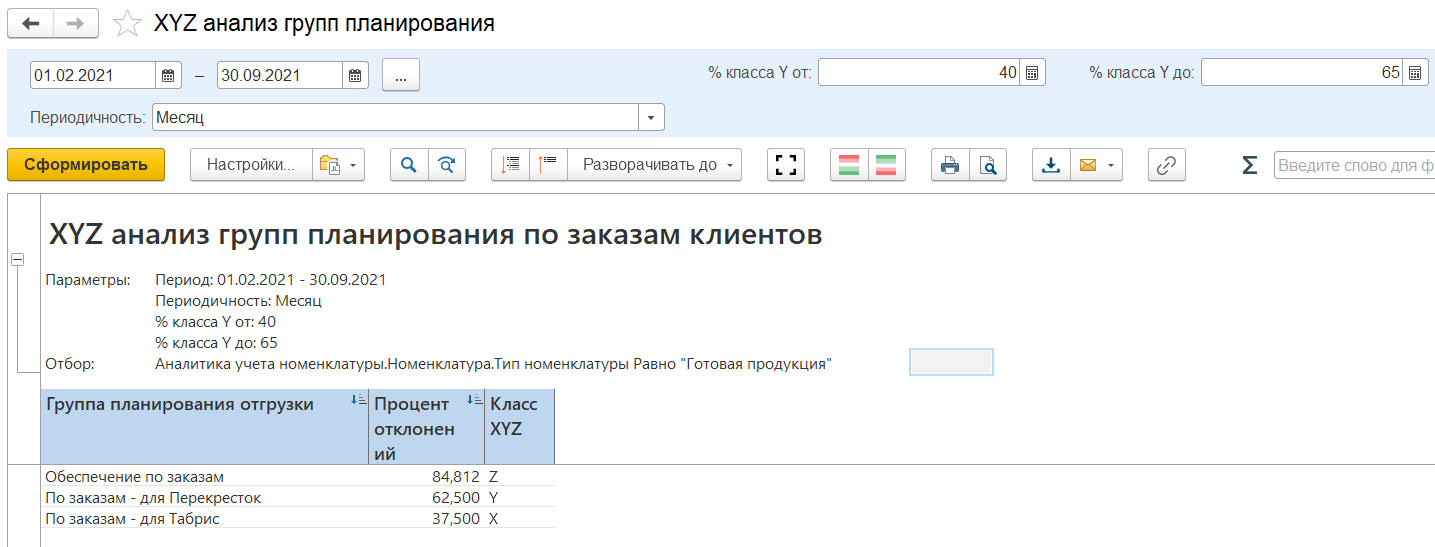 Сформируем отчет для периода: 01.02.2021 - 30.09.2021, периодичность - Месяц, % класса Y от 40, % класса Y до 65
