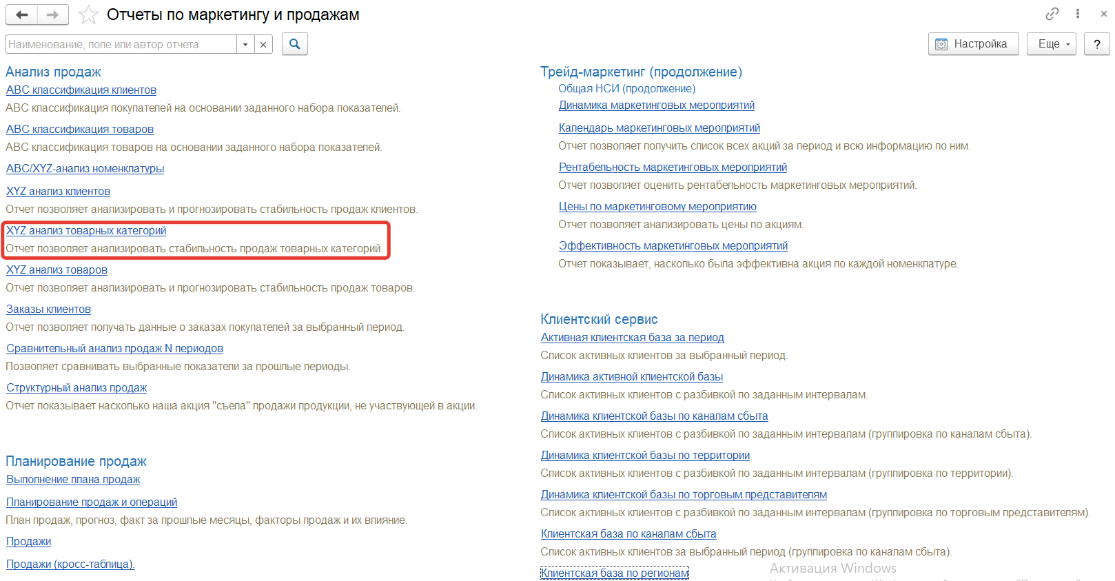 Отчет "XYZ анализ товарных категорий" расположен в разделе "Маркетинг и продажи" в подсистеме "Аналитика" - "Отчеты".