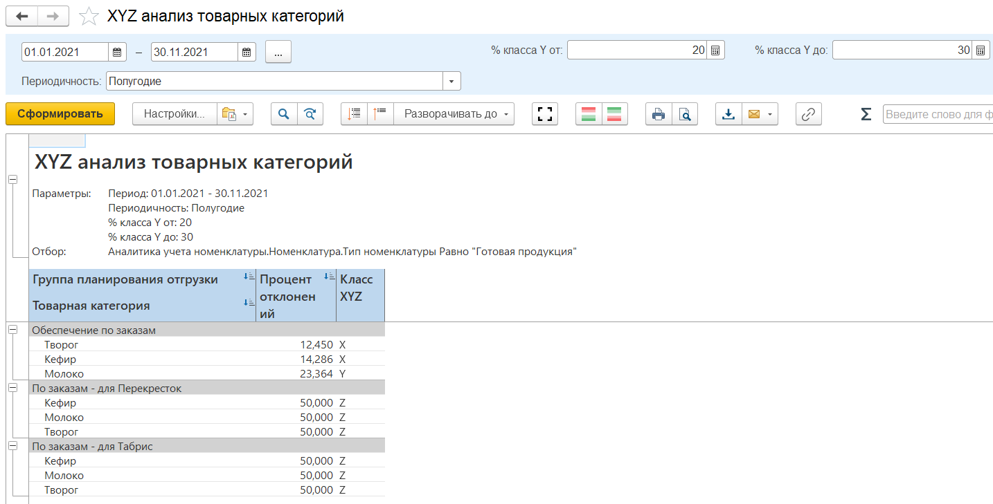 Сформируем отчет для периода: 01.01.2021 - 30.11.2021, периодичность - Полугодие, % класса Y от 20, % класса Y до 30