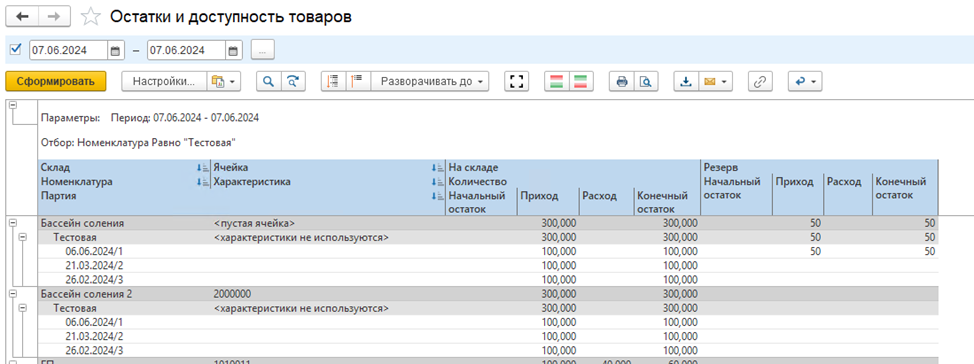 В колонке «Резерв – Конечный остаток» показывается реальное количество зарезервированного товара для неадресных складов.