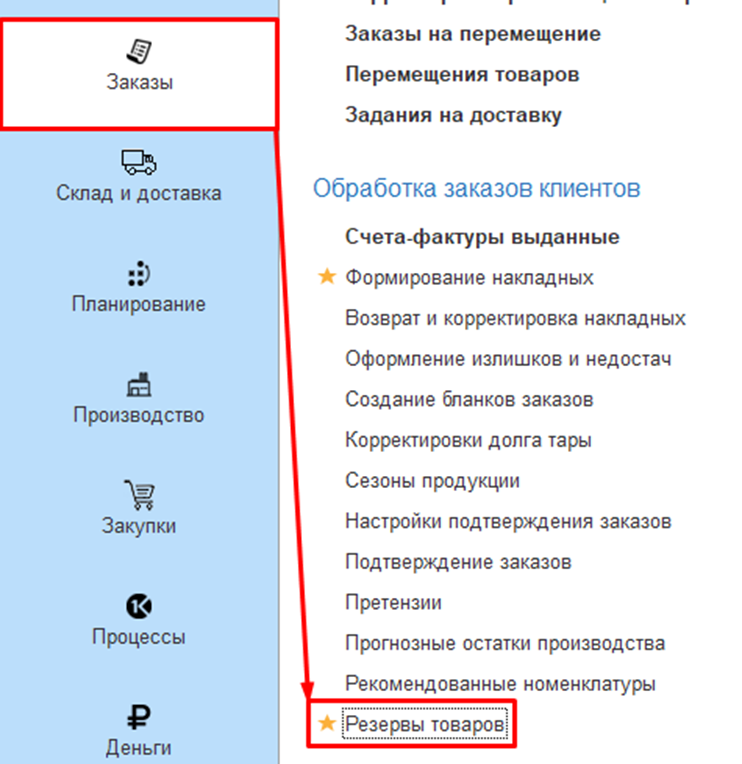 Документ «Резерв товаров» находится в подсистеме «Заказы» – «Обработка заказов клиентов»
