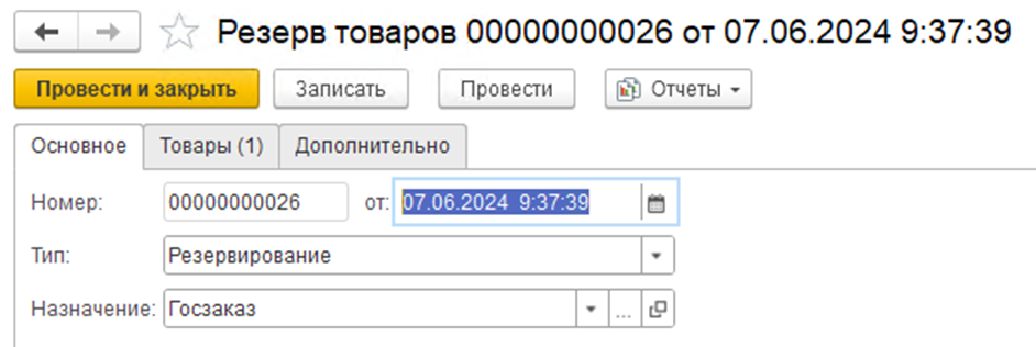 - Дата - Тип «Резервирование» - Назначение, под которое товары будут ставится на резерв