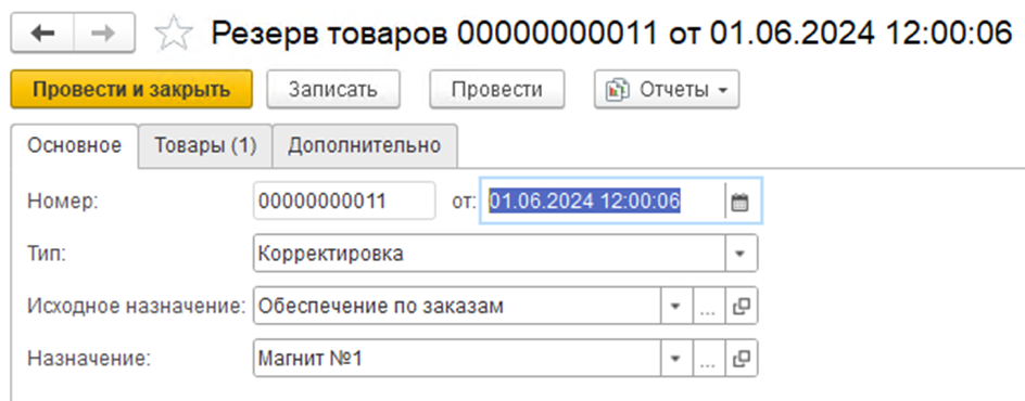 Документ «Резерв товаров» с типом «Корректировка»