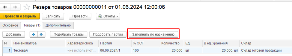 По кнопке «Заполнить по назначению» ТЧ на вкладке «Товары» заполнится товарами, находящимися в резерве исходного назначения. Можно зарезервировать больше, чем было в исходном резерве, если есть свободные остатки.