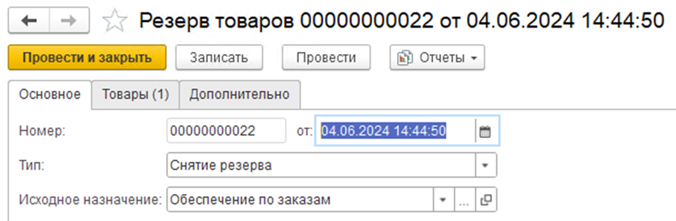 Документ «Резерв товаров» с типом «Снятие резерва»